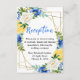 This fun and whimsical wedding reception enclosure card features watercolor blue, yellow and white flowers with foliage on a gold geometric frame. The text combines handwritten script and serif fonts for a stylish and modern look. This is perfect for a spring or summer rustic wedding..