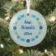 Dieses wunderschöne Glasschmuck zeigt ein digitales Kunstbild einer Gruppe von Blume und Schmetterlingen, von denen jeder einen blauen Farbton aufweist, um einen kleinen Jungen zu repräsentieren. Zu den Blume zählen Dahlias, Wasserlilien, vergessen Sie mich nicht und Chrysanthema. Die Blüten und Schmetterlinge sind in einem Kreis angeordnet, und es gibt einen eigenen Text im Kreis, sodass Sie ihn mit Ihrer eigenen Nachricht personalisieren können.