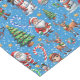 Christmas-themed pattern featuring Santa Claus, reindeer, snowmen, elves, Christmas trees, candy canes, and snowflakes on a blue background