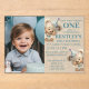 A joyful birthday scene featuring soft blue tones and playful Hedgehogs in party hats. The background is adorned with a gentle heart pattern, creating a sweet and festive atmosphere perfect for celebrating a little one's special day. Whimsical illustrations and cheerful colors evoke warmth, laughter, and the magic of turning one. The central photo is a placeholder, designed to be replaced with your own child's portrait for a personalized touch.