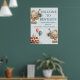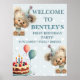 A charming birthday welcome sign featuring two illustrated Hedgehogs in party hats, festive balloons, and a birthday cake with glowing candles. Set against a soft blue background with a delicate heart pattern, the design radiates warmth and celebration. The central message is customizable, making it perfect for greeting guests at a joyful first birthday gathering.
