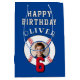 Blue Personalisiert Baseball Ball Kindergeburtstag Foto Mittlere Geschenktasche. Baseball Geburtstagsgeschenk Tasche mit einem individuellen Foto. Fügen Sie Ihr Foto, Ihren Namen und Ihr Alter hinzu.