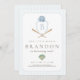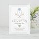 Feiern Sie Ihren ersten Geburtstag mit diesem klassisch blauen Baseball mit einem Monogramm-Wappen und einem Vintagen Fledermaus- und Ballmotiv. Ideal für ein zeitloses, preppy Style Sport Party!