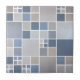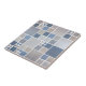 Eine elegante und moderne Küchen- oder Badezimmerfliese mit geometrischen Mosaikmustern und subtilen, am Strand inspirierten Aquarelleffekten in den Farben Blau, Grau und Beige.