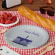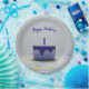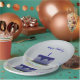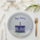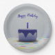 Ein blauer Cartoon-Geburtstagskuchen mit sprinklerbedecktem Zuckerguss, der die Seiten hinunter läuft, und eine beleuchtete Kerze sitzt auf einer goldenen Platte auf einem Tresen, der mit bunten Punkten bedeckt ist.