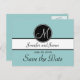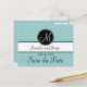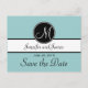 Elegante, einfache, blaue, schwarze und weiße Monogramm Moderne Save the Date Postkarten. Elke Clarke © Diese Hochzeitankündigungskarten werden mit einem hellblauen Hintergrund, weißes Monogramm initialisiert auf einem schwarzen Kreis Tag und Braut und Bräutigam Namen auf einem schwarz-weißen Streifen angezeigt. Passen Sie mit Braut- und Bräutigam-Namen und Ihrem Hochzeitsankündigungstext, dem Monogramm-Anfangs- und dem Hochzeitsdatum auf, indem Sie Zazzle's einfach zu bedienende Menüeinträge verwenden. Dieses einfache, aber elegante Monogramm Erstdesign funktioniert für alle Buchstaben des Alphabets und ist vollständig anpassbar. Weitere Farbkombinationen erhalten Sie unter luxuryweddinginvitations@gmail.com