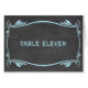 Elegante und trendige Chalkboard Tischnummer Card mit einem Chalkboard-Look Hintergrund und einem extravaganten Deko mit Schwirl und Blatt in hellblau. Einfach anzupassen, fügen Sie einfach die passende Tischnummer(en) in das Textfeld ein. Klicken Sie auf "Anpassen", um weitere Personalisierungsoptionen zu erhalten.