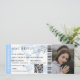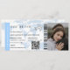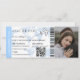 Moderner, staubblauer Boarding in minimalistischem Mono-Stil verpasst Hochzeitsfahrkarte mit schlichtem weißem und braunem Hintergrund, Foto des verlobten Ehepaares, Flugzeug mit Loop-Trail und leicht anpassbarer Save the Date Vorlage. Vergessen Sie nicht, den Text auf der Rückseite des Monogramms zu ändern.