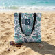 Maßgeschneiderter mit Monogramm Totbeutel mit einem Vintagen, bohfarbenen Blumenmuster in Blau- und Weißtönen. Personalisieren Sie es mit dem Monogramm-Initial in einem dunklen Marinekanal. Verwenden Sie die Entwurfswerkzeuge, um die Textfarben und Schriftart zu bearbeiten und eigene Fotos hinzuzufügen, um ein Design zu erstellen.