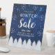 Blauer und weißer Winter Einzelhandelsumsatz Werbung Pedestal Schild mit Winterbäumen, Schneeflocken & Blue Bokeh Hintergrund.