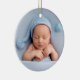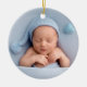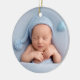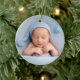 Is it your baby boy's first Christmas this year? Honor the milestone with a personalized blue Christmas ornament printed with a photo of your newborn son on one side, and a simple illustration of blue baby feet and a blue bow on the other side against a background of white snowflakes on light blue. Personalize with your son's name and the year. A great gift for both parents and grandparents!