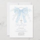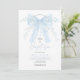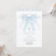 Featuring a soft powder-blue ribbon bow adorned with delicate florals and pearls, plus a classic cross and airy script typography.