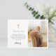 Baptism thank you card that features a blue bow and a simple gold cross.