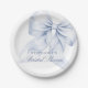 Diese elegante Papierplatte zeichnet sich durch einen zauberhaften blauen Bogen aus, der perfekt für ein "etwas blaues" Brautparty geeignet ist. Es ist in sanften pastellfarbenen Aquarellen gestaltet und verbindet romantische handgeschriebene Skripte mit trendigen whimsical Elementen. Ideal für ein staubblaues Brautparty.
