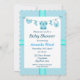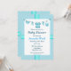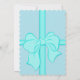 Einladungen für ein blaues Baby. Auf der Vorderseite ist eine blaue Hintergrundfarbe mit einem Muster von winzigen Polka-Punkten und einem hellblauen Band, das in der Mitte durchkreuzt ist. Über dem Hintergrund befindet sich ein weißer Rechteck, um alle Details hinzuzufügen. Alle Texte sind hellblau und dunkelblau. Oben im Rechteck befindet sich eine Waschleine mit blauen Babykleidern, die an das Rechteck geklemmt sind. Auf der Rückseite ist ein blauer Hintergrund mit winzigen Polka-Punkten und einem überkreuzten blauen Band mit einem großen blauen Bogen in der Mitte.