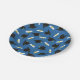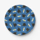 Graduation party paper plates printed with a blue pattern of graduation caps and diplomas with a yellow ribbon.