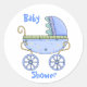 Sweet Baby Dusche Einladung / Ankündigung Umschlag Aufkleber. Niedliche Grafik einer bunten Baby-Buggy, auf weißem Hintergrund, mit blauem Text lesend Baby Shower, dass Sie es personalisieren können, um alles zu lesen, was Sie gewollt haben. Eine tolle Touch für die Duscheinladung eines kleinen Jungen.