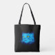 Ein fraktalisiertes blaues Katzengesicht mit atemberaubend gelben Augen vor schwarzem Hintergrund.