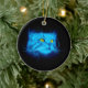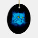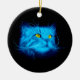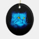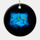 Ein fraktalisiertes blaues Katzengesicht mit atemberaubend gelben Augen vor schwarzem Hintergrund.