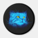 Ein fraktalisiertes blaues Katzengesicht mit atemberaubend gelben Augen vor schwarzem Hintergrund.