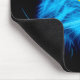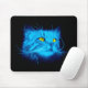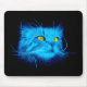 Ein fraktalisiertes blaues Katzengesicht mit atemberaubend gelben Augen vor schwarzem Hintergrund.