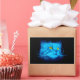 Ein fraktalisiertes blaues Katzengesicht mit atemberaubend gelben Augen vor schwarzem Hintergrund.
