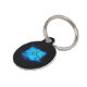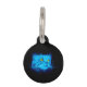 Ein fraktalisiertes blaues Katzengesicht mit atemberaubend gelben Augen vor schwarzem Hintergrund.
