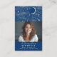 Sternenhimmelkarten. Diese kleinen blauen Beerdigungskarten mit Sternenhimmel und Mond sind ein unvergesslicher Sake, der sich ideal zum Gedenken an Ihren Lieben bei jeder Beerdigung oder Feier des Lebensdienstes eignet. Die Vorderseite der Karte zeigt elegant den Text "In Loving Memory" unter einem Foto, zusammen mit dem Namen und den Daten. Auf der anderen Seite ist die Karte so konzipiert, dass sie ein Gedicht nach Maß aufnehmen kann. Sie bietet die Möglichkeit, es ganz nach Ihren Wünschen zu personalisieren oder durch Wörter Ihrer Wahl zu ersetzen.