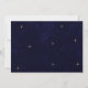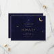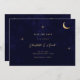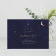 Eine minimalistische, moderne himmlische Hochzeitseinladung zeichnet sich durch ein schlichtes und elegantes Design aus. Es beinhaltet einen vergoldeten Mondfilm und Sterne, die sanft glitzern, Set vor einem Mitternachtsblauen Hintergrund. Die Einladung benutzt klassische Serifentypografie, die eine traditionelle und formale Touch mit ihrem gepflegten und klaren Stil hinzufügt.