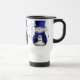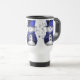 Ein skurriler, niedlicher Schneemann, der in einem blauen Samthut und einer Weste gekleidet ist und zu Weihnachten von blauen Sternen umgeben ist.
