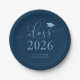 Einfache und elegante Graduiertenplatte mit Typografie-Text, der "class of2025" im Script-Schriftart mit Graduiertenmütze-Illustration sagt. Der Hintergrund ist marineblau.