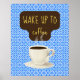 Dieses Poster bietet eine heiße Tasse Kaffee vor einem Hintergrund von charmanten blauen traditionellen Mosaikfliesen. Das zeitlose Design strahlt Wärme und Gemütlichkeit aus und macht es zu einer stilvollen Ergänzung Ihrer Küche, des Speisesaals, des Frühstücksschalters, der Kaffeeküche oder sogar der Bürobühne. Das einfache und doch kraftvolle Motto "Weck bis zum Kaffee" klingt bei Kaffeefans gut und inspiriere einen erfrischenden Start in den Tag.