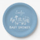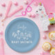 Ein Blue Coquette Modern Hand Drawn Baby Shower Party Dekor Papierplatte Design typisch kombiniert skurrile, spielerische Elemente mit einer zeitgenössischen Ästhetik. Die Größe ist Standard und beliebt, aber andere Formate sind verfügbar. Die dominierende Farbe ist in sanften, babyblauen Tönen gehalten, die ein sanftes, feminines Ambiente schaffen. "Coquette" schlägt ein zauberhaftes Ambiente vor, mit feinen, handgezeichnet Illustrationen von Elementen. Moderner typografischer handgeschriebener Schriftart mit minimalistischen serifenlosen Schriftart für ein ausgeglichenes, raffiniertes Aussehen. Diese Einladung weckt ein Gefühl von Wärme und Aufregung für die bevorstehende Feier, die Freude einer Babydusche mit einem On-Trend, künstlerisches Design vermischt.