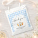 Send guests home with a sweet "thank you" using this charming baby shower favor bag, designed to coordinate with my "cutie pie" invitation suite. Featuring a soft blue gingham background with white floral accents, and a charming pumpkin pie graphic topped with whipped cream and a blue bow, this bag adds a heartfelt and stylish touch to your celebration.
