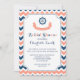 Nautical Thema Braudusche Einladungen in modernen dunkelmarineblau, pfirsichorange rosa und Zickzack Streifen Muster mit Schiff Rad und lustige Banner.