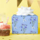 Blauer Blumenstrauß mit weißem Bogen auf blauem Hintergrund. Die Hintergrundfarbe kann geändert werden.