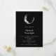 Halloween-Party Einladung Postkarte mit einer mystischen Abbildung. Ein dunkelblauer Halbmond mit einer eleganten, dünnen Kontur und weißer Blume blüht an seinen Kanten.