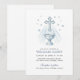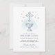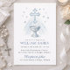 Diese schöne Tauf-Einladung zeigt ein ruhiges, blaues Wasserfarben-Design mit einem markanten Kreuz und einer Schrift-Schale, umgeben von sanften Sternen. Die weichen Blautöne und zarten Details schaffen eine friedliche und spirituelle Atmosphäre, perfekt, um den besonderen Tag Ihres Kindes zu feiern. Sie ist ideal, um die Taufe, die Taufe oder die Namenszeremonie eines kleinen Jungen anzukündigen. Die elegante Schrift für "Anschließender Empfang" verleiht diesem Gedenkstück einen Hauch von Raffinesse.