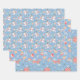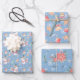 Ein koordiniertes Set von winterbezogenen Verpackungsfolien in blau für Ihre saisonalen Geschenkbedürfnisse. Hier haben wir einen tanzenden Schneemann in einem fröhlich grünen Hut mit einem rot gestreiften Schal. Es gibt hübsche Poinsettas mit Schneeflocken und Grünpflanzen. Und die Urlaubssaison ist einfach nicht so fröhlich ohne die Ornamente, Glocken und Lebkuchen!