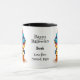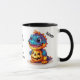 Hier ist eine niedliche Halloween-Tasse für Kinder, die mehr Spaß macht als beängstigend, und leicht für Enkel, Sohn oder Tochter angepasst werden kann. Ein hellblauer Dinosaurier mit orangefarbenem Jack oder Laternenroars auf beiden Seiten der Tasse, in der Mitte schwarzer Text, den Sie für Ihren Gruß anpassen können. Besonders geeignet für kleine Kinder.
