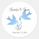 Blaue Tauben mit einem Band mit Hochzeitsringen. Text kann angepasst oder gelöscht werden.