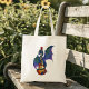 Ein kleiner blauer Drache mit lila, grünen und blauen Flügeln schmückt sich um eine sonnige Gitarre aus Rot, Orange und Gelb, der Schwanz und der Hals sind sanft um den Sockel und den Hals der Gitarre gewickelt. Eine magische Mischung aus Musik und Fantasie, perfekt für Musikliebhaber und Fantasy-Fans.