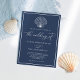 Dieses schlichte marineblaue Hochzeitsdesign hat eine Jakobsmuschel-Muschel oben, eine elegante Schriftzeichen-Kalligraphie und einen Rahmen um den Rand.