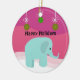Ein niedliches Design für den Elefantensammler. Ein rosa Hintergrund mit grünen Ornamenten. Ein niedlicher, blauer Elefant betont diesen Schmuck.