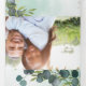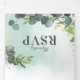 In einem botanischen Grün Hochzeit dreiteilige Einladung mit einer rustikalen verblassten Aquarell gespült Kulisse, elegante blaue Eukalyptus-Blätter, Spritzen von Imitaten Goldfolie, Ihre Initialen, die Hochzeitsdetails, Einladung und eine uAwg Postkarte für Ihre Gäste abschneiden und zurückschicken.