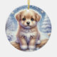 This endearing ornament showcases a fluffy puppy with soulful blue eyes, nestled on a snowy log beneath twinkling stars. Surrounded by frosty trees and glowing lights, it’s a magical tribute to innocence and holiday warmth.