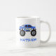 Eine Tasse, die einen blauen Monster-LKW mit Flamme zeigt. Sie können der Tasse Ihren Namen hinzufügen. Ideal für Leute, die Monster-LKW-Fans sind.