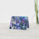 Blaue Hydrangeas-Beileid-Karte mit Schrift und eigener Nachricht. Die gefalteten Karten sind in blau, lila und grün mit Hydrangea-Blütenblättern bedeckt. Das Blumendesign ist auch der Hintergrund für den Text im Inneren. "Denken Sie an Sie" Text auf der Vorderseite in Weiß, mit einer Beispiel-Beileid-Nachricht unten. Eine Beispielschrift aus dem Buch von Isaiah wird auf der Innenseite in Weiß über lila gedruckt. Die Schrift ist: "Also fürchte mich nicht, dass ich bei dir bin; sei nicht bestürzt, denn ich bin dein Gott. Ich werde dich stärken und dir helfen; ich werde dich mit meiner rechten Hand hochhalten."