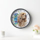 In dieser Aquarellenanordnung von blauen und violetten Blumen und grünen Blätter ist ein wunderschönes Bild eines bufffarbenen amerikanischen Cocker Spaniel Hund. Dunkelgraue Zahlen und Marker rund um den Bereich machen die Uhr leicht lesbar. Alles ist auf einem weißen Hintergrund platziert.
