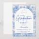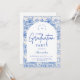 An elegant graduation celebration design featuring a delicate blue toile floral border inspired by classic European porcelain and vintage botanical prints. The intricate florals frame a clean arched center panel, creating a refined and timeless composition that highlights the graduate’s name and event details beautifully. Soft blue tones against a crisp ivory background give the design a sophisticated yet celebratory feel. Perfect for a stylish graduation gathering with a classic, romantic aesthetic.